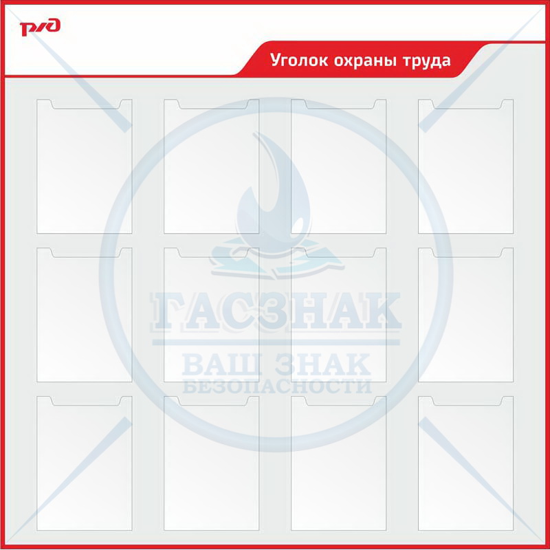 Стенд Уголок по технике безопасности РЖД, 1 карман А3 гор, 4 А4 объемн., 6 карманов А4 пл. (1650х1100; Пластик ПВХ 4 мм, алюминиевый профиль; )
