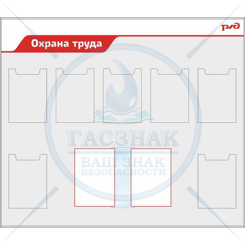 Стенд по охране труда для ОАО РЖД Охраны труда, металлокомпозит, 3 мм с профилем NIELSEN, с 6-ю карманами и перекидной системмой А4 на 10 рам.(1400х1200)