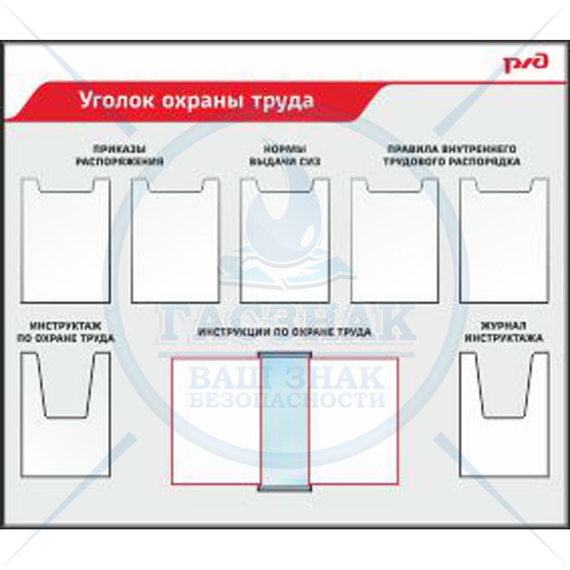 Стенд. Стенд Уголок по охране труда ( 4 кармана формата А4, плоских, 2 кармана формата А4, объемных) стиль РЖД с логотипом, Логотип (1000х1000; Пластик ПВХ 4 мм, алюминиевый профиль; )