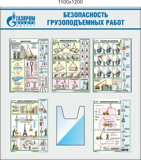 Стенд Безопасность грузоподъемных работ, 5 плакатов А3, 1 карман А4 (1100х1200; Пластик ПВХ 4 мм; Алюминиевый профиль)