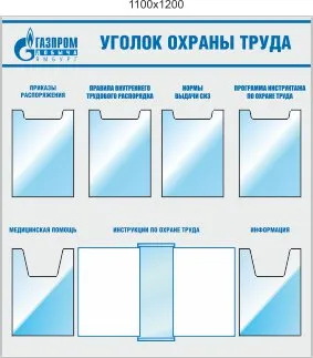 Стенд Охрана труда, 6 плоских карманов А4, фриз с надписью и логотипом Газпром. (1000х1000; Пластик ПВХ 4 мм; Пластик)