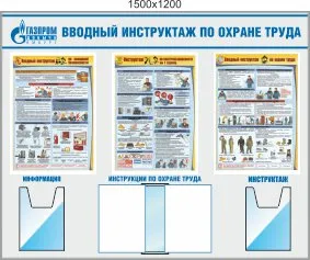 Стенд Вводный инструктаж по ОТ, 3 плаката А2, 2 объемных кармана А4. 1 перекидная система А4 на 10 л. (1500х1200; Пластик ПВХ 4 мм; Алюминиевый профиль)