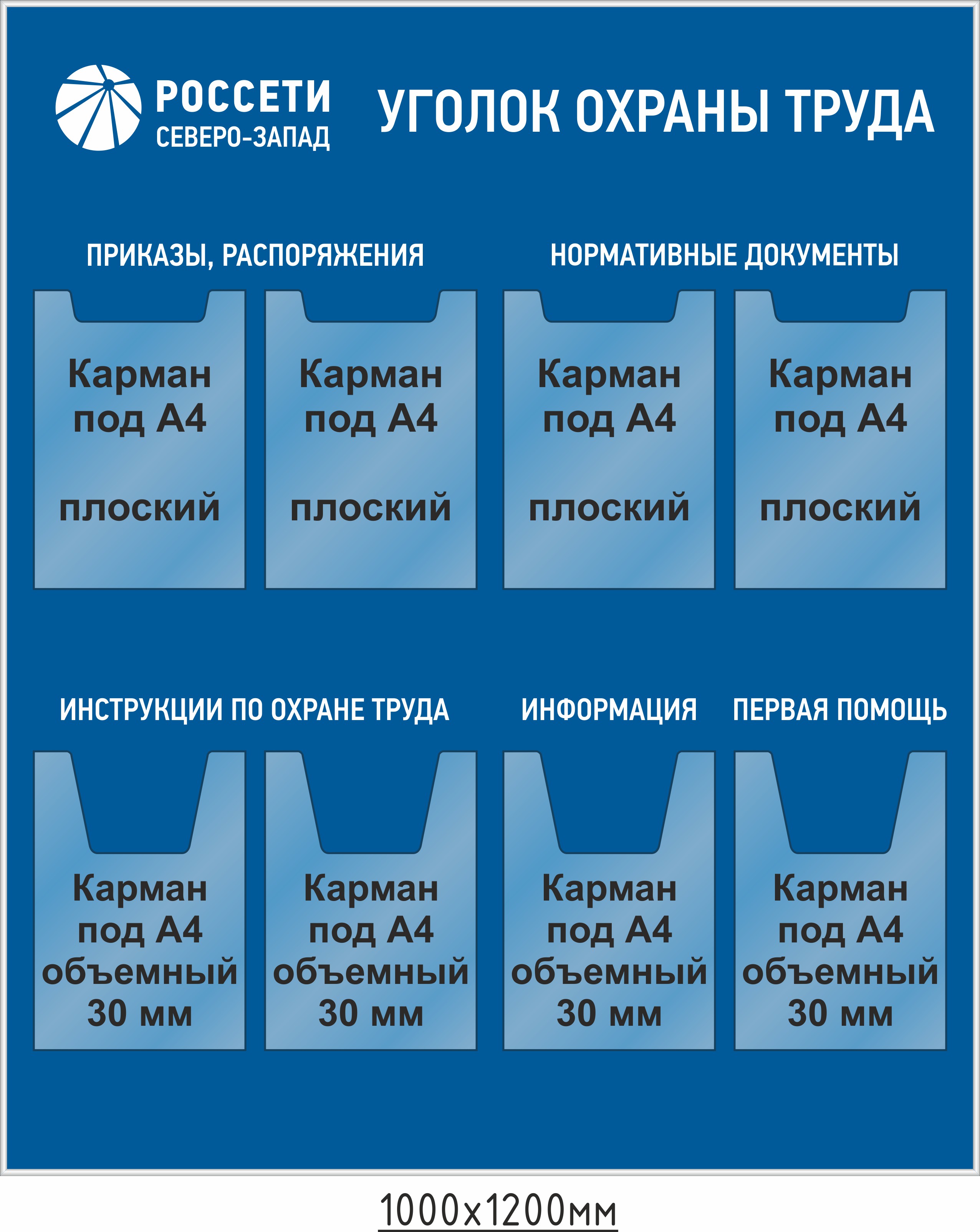 Стенд Охрана Труда, фриз-синий с белыми буквами, фон серый, 6 объемных карманов А4, карманы с надписями (Пластик ПВХ 4 мм, алюминиевый профиль; 1200х1000)