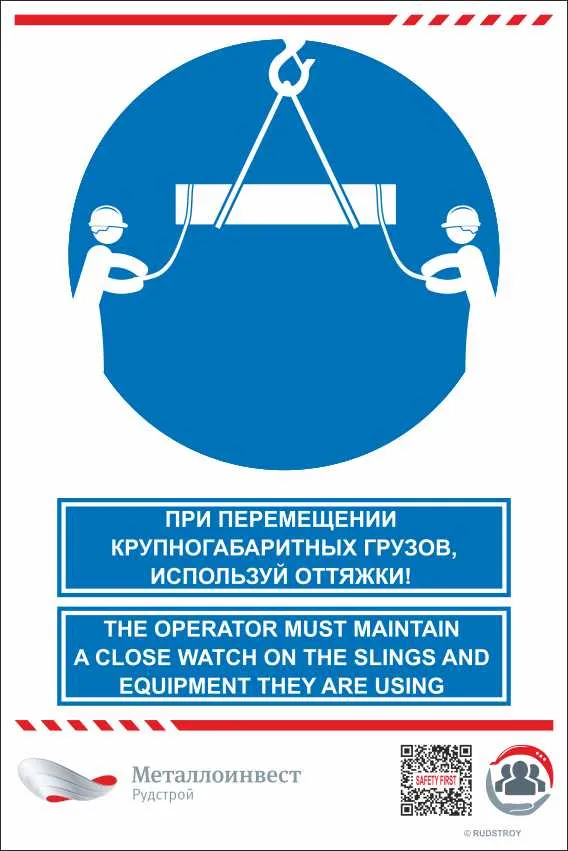 Мультиязычный знак безопасности - При перемещении крупногабаритных грузов, используй оттяжки!